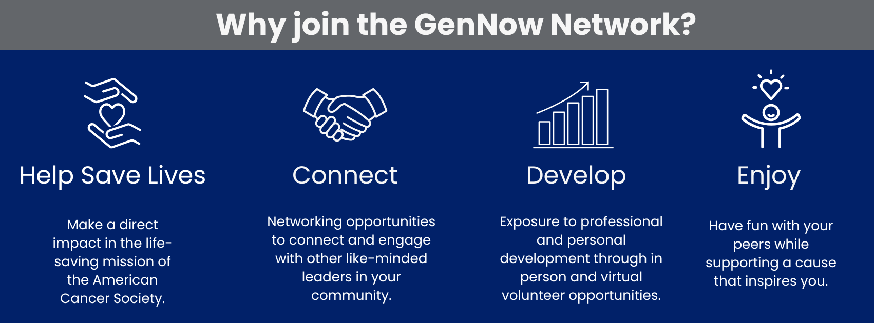ACS’ young professionals’ program, formerly known as the Associate Board of Ambassadors (ABOA), is rebranded as the GenNow Network. This new brand and chapter structure reflects the American Cancer Society’s commitment to engaging the next generation of leaders in the fight against cancer, uniting them under a shared mission to make a profound impact.
